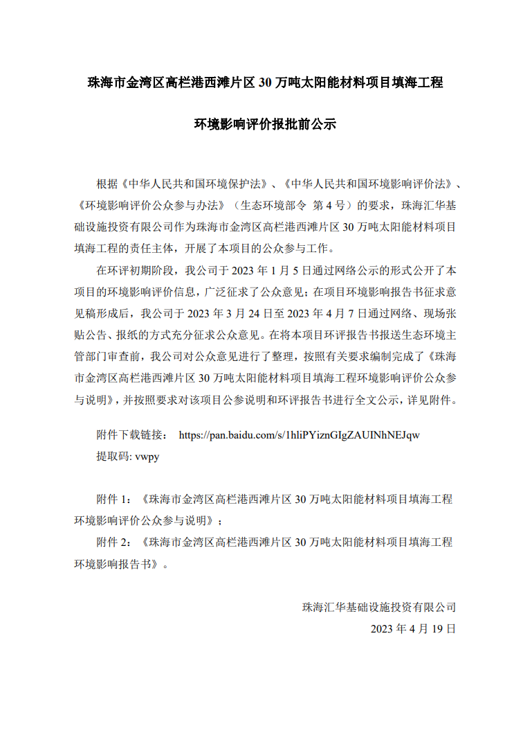 【批前公示】珠海市金湾区高栏港西滩片区30万吨太阳能材料项目填海工程环境影响评价报批前公示