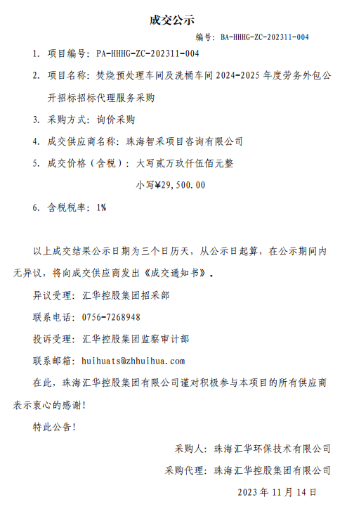 【成交公示】焚烧预处理车间及洗桶车间2024-2025年度劳务外包公开招标招标代理服务采购