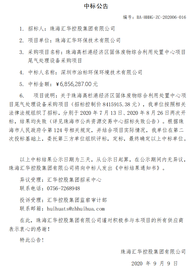 【中标公示】珠海高栏港经济区固体废物综合利用处置中心项目尾气处理设备采购项目