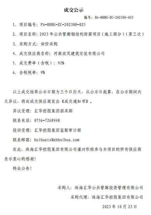 【成交公示】2023年公共管廊钢结构防腐项目(施工部分)(第三次)